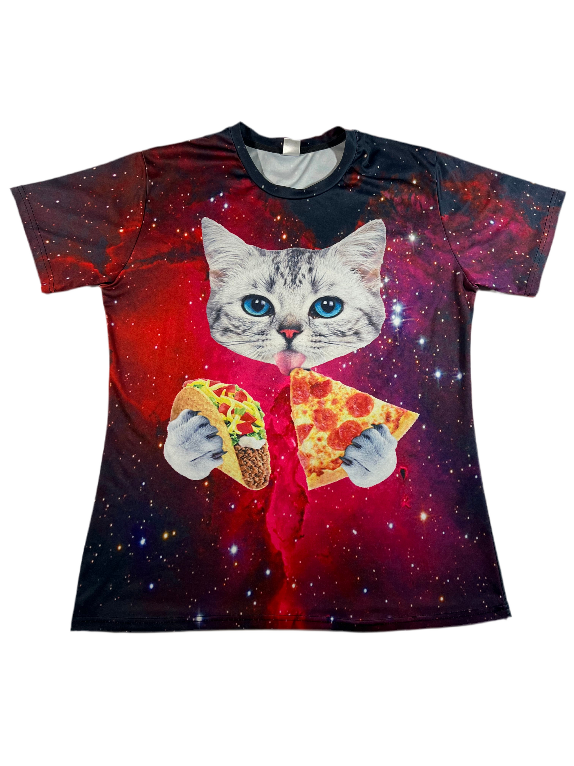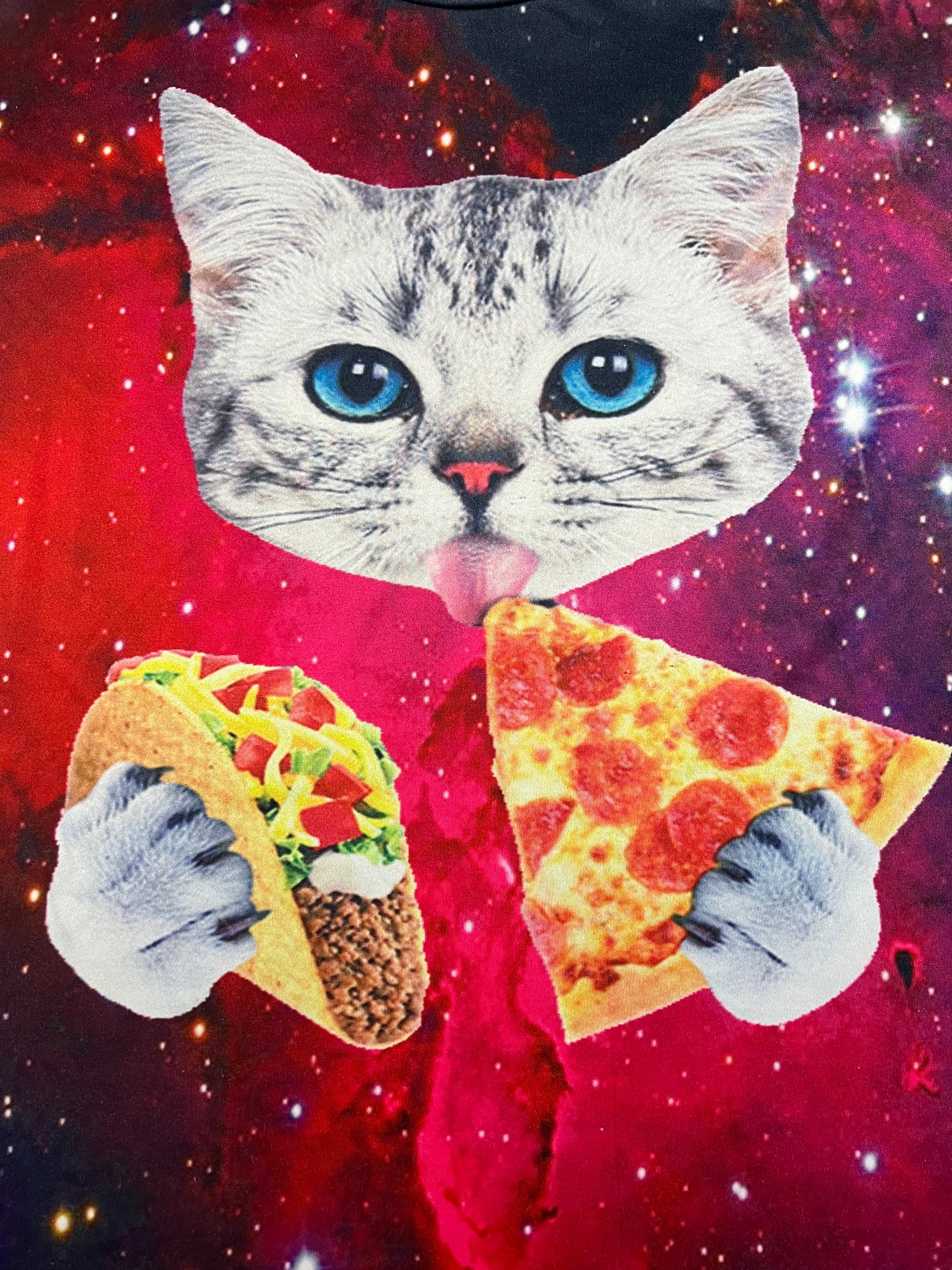 Cat eating tacos and pizza in space